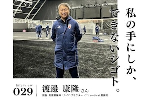 治療、リラクゼーション、歯科業界など、人々の痛みや不調に寄り添う仕事の魅力を紹介する本企画。今回お話を伺うのは、店舗を持たずに全国を巡りながら施術を行い、ソサイチ(7人制サッカー)の日本代表チームでメディカルトレーナーも務める柔道整復師の渡邉康隆さんです。