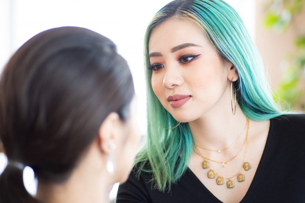 「まだこの業界に入りたての頃です。分厚いレンズのメガネをかけていらっしゃるお客様に接客しました。ファンデーションとアイシャドウをお探しということで、お客様のご要望も多く、うまくくみ取ることができていないと感じていました。お客様が『私の肌のカラーにちゃんと馴染んでいますかね?心配で。』と不安そうに笑いながら悩まれている姿を見て、私は思うようにニーズをくみとることができないもどかしさから、正直なところ、その場を離れたい気持ちになってしまいました。すると、お客様が『実は、私は病気で年々視力が低下しているんです。アイテムの色がよく見えず、自分の肌にカラーが合っているのかもよく分からないんです。時間がかかってしまって、ごめんなさいね』と打ち明けてくださいました。