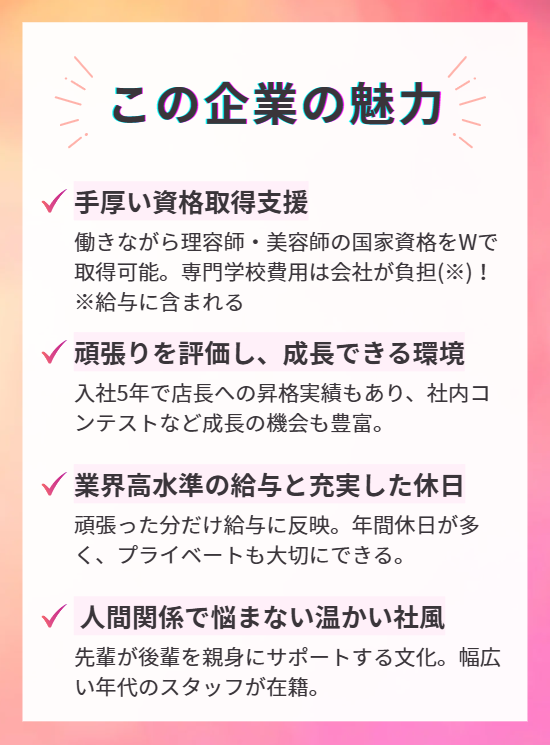 ・専門学校費用を会社で負担し(※)、理容師・美容師免許をWで取得可能