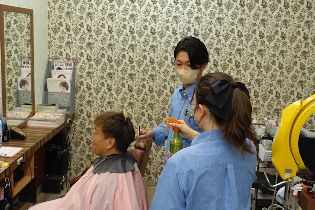 「ラッキーホールディングス」には、専門学校費用を会社で負担し(※)、理容師・美容師免許をWで取得できる制度があるため、千代さんのように意欲のある人が挑戦しやすい環境があります。入社後は講習会が行われるので技術をしっかり習得できますし、年に2回行われる社内コンテストで評価を受けることができるため意欲を持って成長をし続けることが可能です。