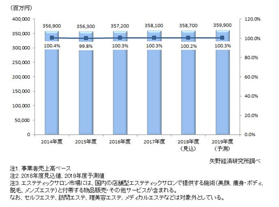 まず、エステティックサロンの件数の推移としては、ここ2~3年では大きな変化はありません。数字でいうとエステ業界の市場全体で約3587億円と言われており、ここ数年3,560億~3,590億の間を行ったり来たりしています。今年の見込み数字では3599億と言われているため、前年比でいくとわずかに上昇していると言えます。