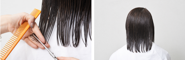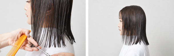 バックサイドは、トップの角を削るようにチョップカット。フロントサイドのレイヤーとつながる程度のイメージで。