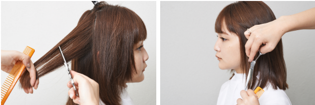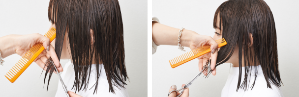 顔周りの髪は、頬骨の高さに合わせて、前上がりにカット。やや前に引き出して、バックとつながるようにチョップカットでラインをぼかす。