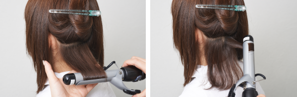 26㎜のヘアアイロンを使用。バックをざっくりと数段に分ける。内巻きにワンカールをつけたら、間隔をあけて毛束を取り、ラフに1回転のMIX巻き。