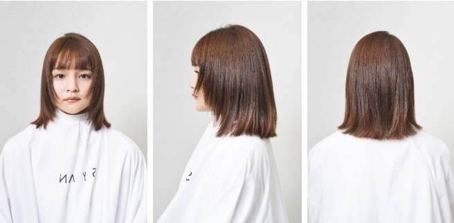 眉下に設定した前髪は、薄く狭く取ってブラントカット。いわゆるパッツン前髪も、シースルーにすることでトレンド感アップ。