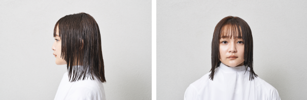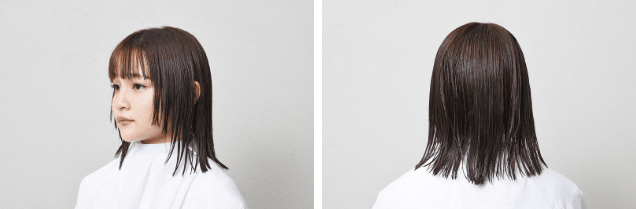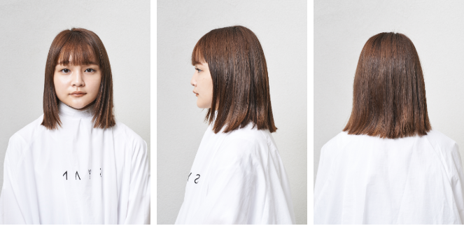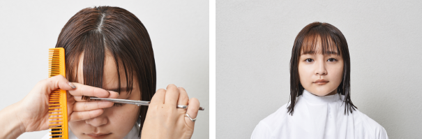前髪は眉下に設定。狭め&薄めに三角ベースで取り、ダウンステムでブラントカット。