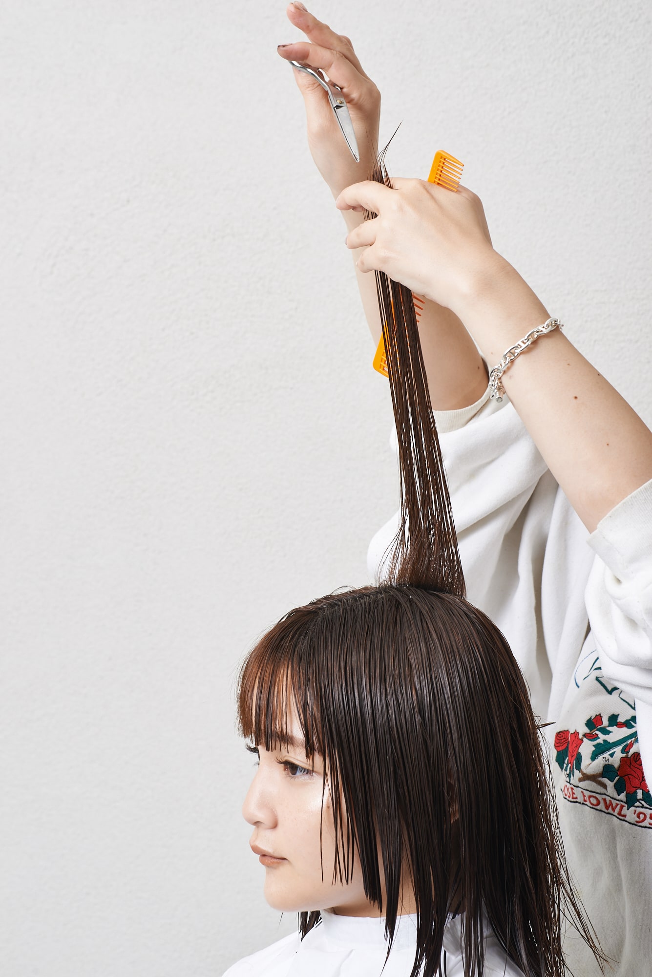 重さのあるカットラインが特徴の姫カットをベースに、髪表面にレイヤーをオン。軽やかな動きをつけることで、今の空気感を表現。レイヤースタイルも、ウエイト重めなら扱いやすい。