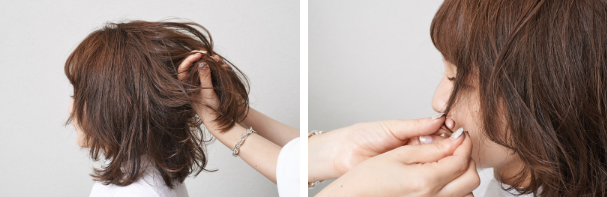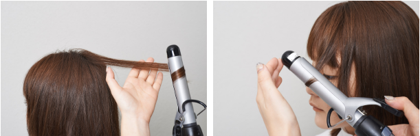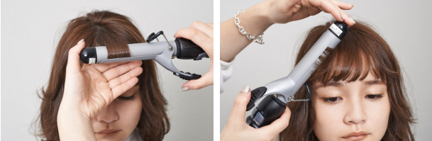 前髪は、前に引き出しながら内巻きにワンカールつける。サイドバングはリバースに巻く。