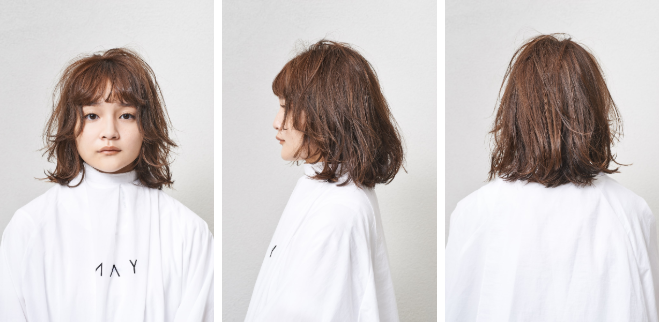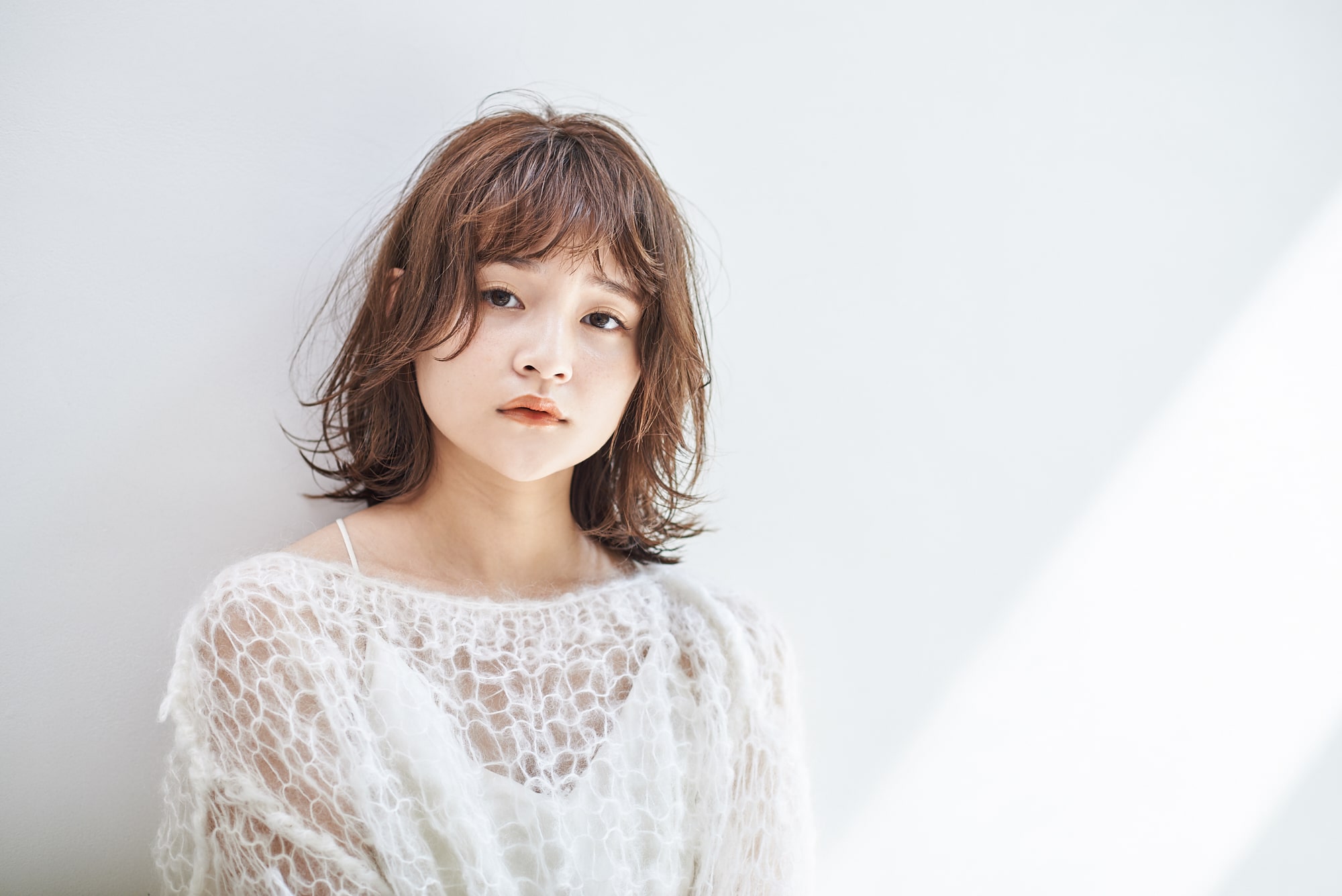 裾に重さがありつつ、表面のレイヤーで軽やかな印象。透け感のあるバングで抜け感をプラスして。