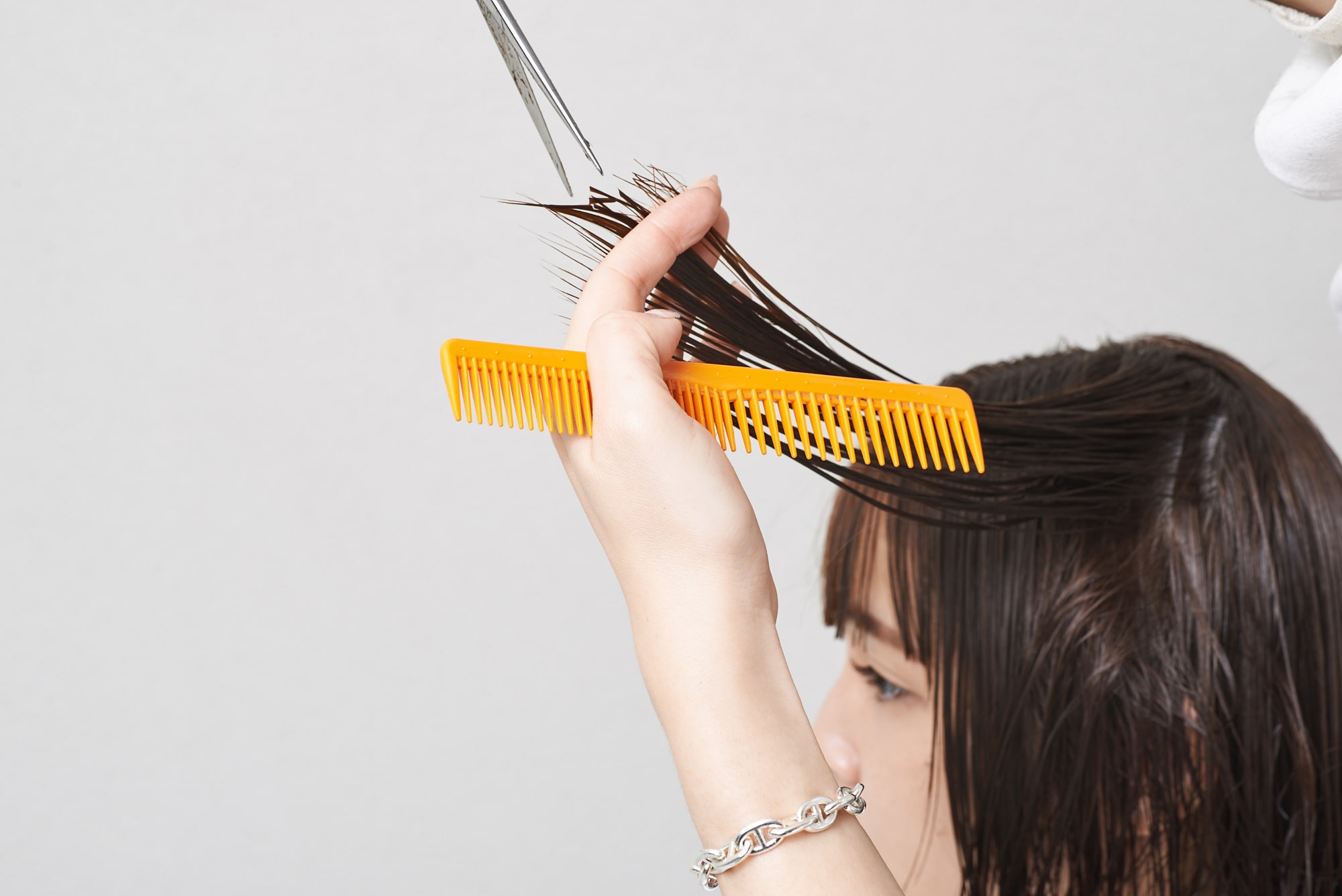 サイドのアウトラインは、気持ち前上がりにカット。レイヤーを入れたときを想定し、そこにつながるようにする。