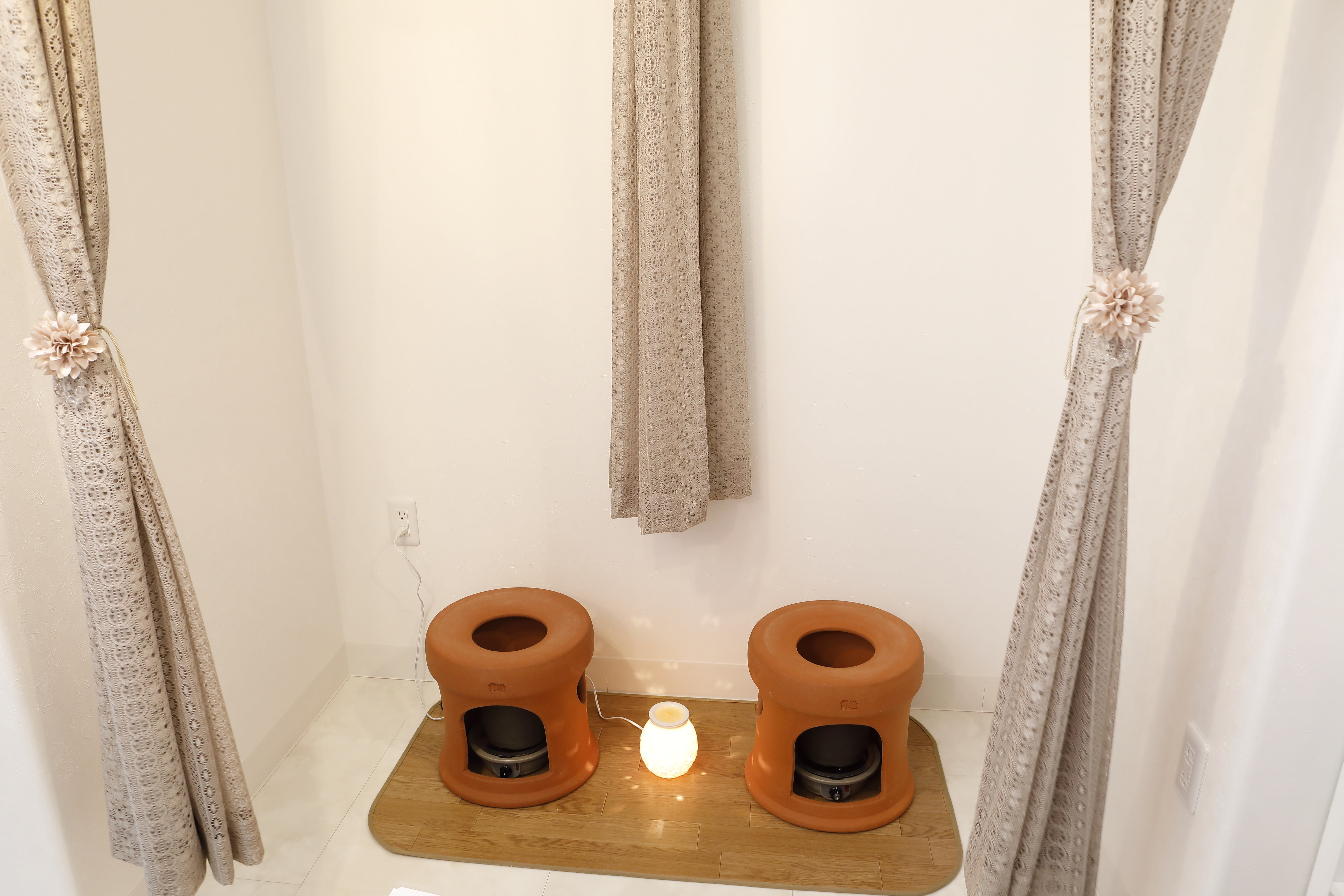 「よもぎのスチームにより身体の健康と美を高めるコースです。お客さまには洋服を脱ぎ専用のマントを着用していただき、よもぎをメインとした座浴剤を焚く壺がセットされた座浴器に腰掛けていただきます。そして下腹部からスチームを浴びることで身体を温めていくんです。『ソワン沙季』では、よもぎをメインとした座浴剤を3タイプ用意しておりお客さまの状態に合わせて使いわけています」