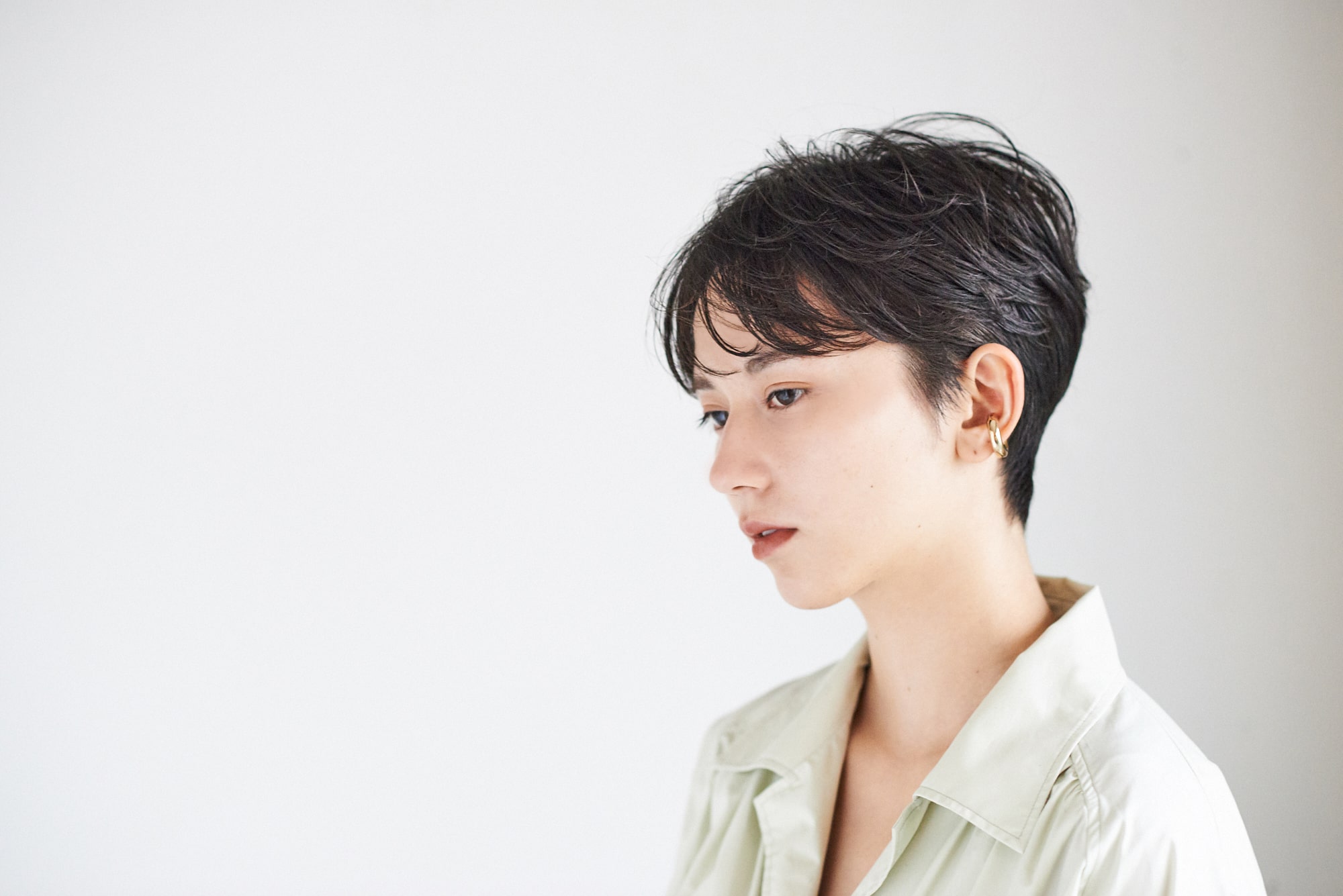 ツーセクションのショートヘアにトレンドな'90年代風のテイストを加え、ジェンダーレスでカジュアルモードな雰囲気に。センターパートで耳をくっきり出したベースカットに、パラっとした少なめの前髪でこなれ感アップ。黒髪が映えるセミウエットな質感で。