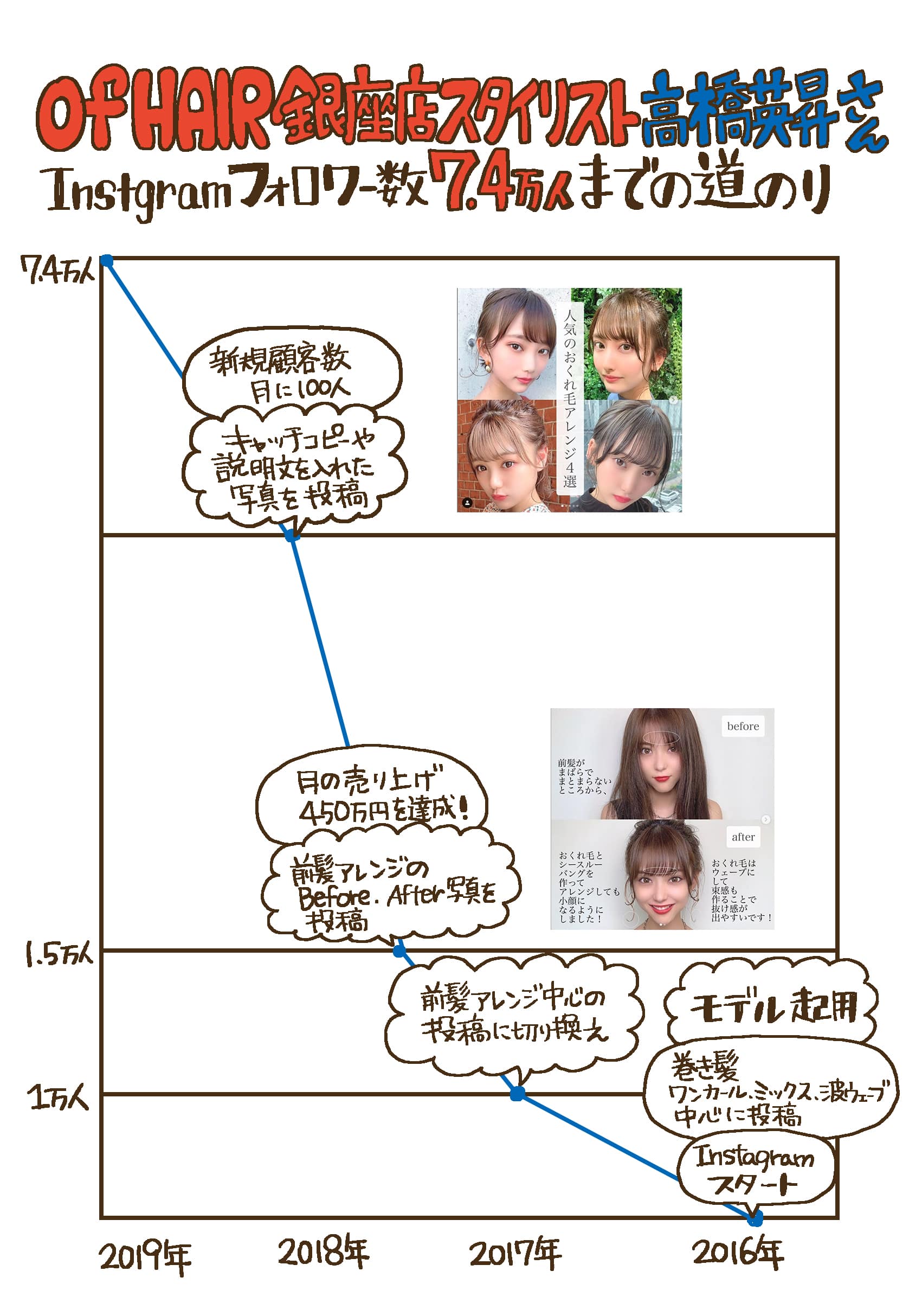 前髪のBefore・Afterの投稿がきっかけでフォロワー数をぐんと伸ばし、人気美容師の座にのぼりつめたOf HAIR銀座店の高橋英昇さん。次回はハッシュタグの活用方法を紹介します。
