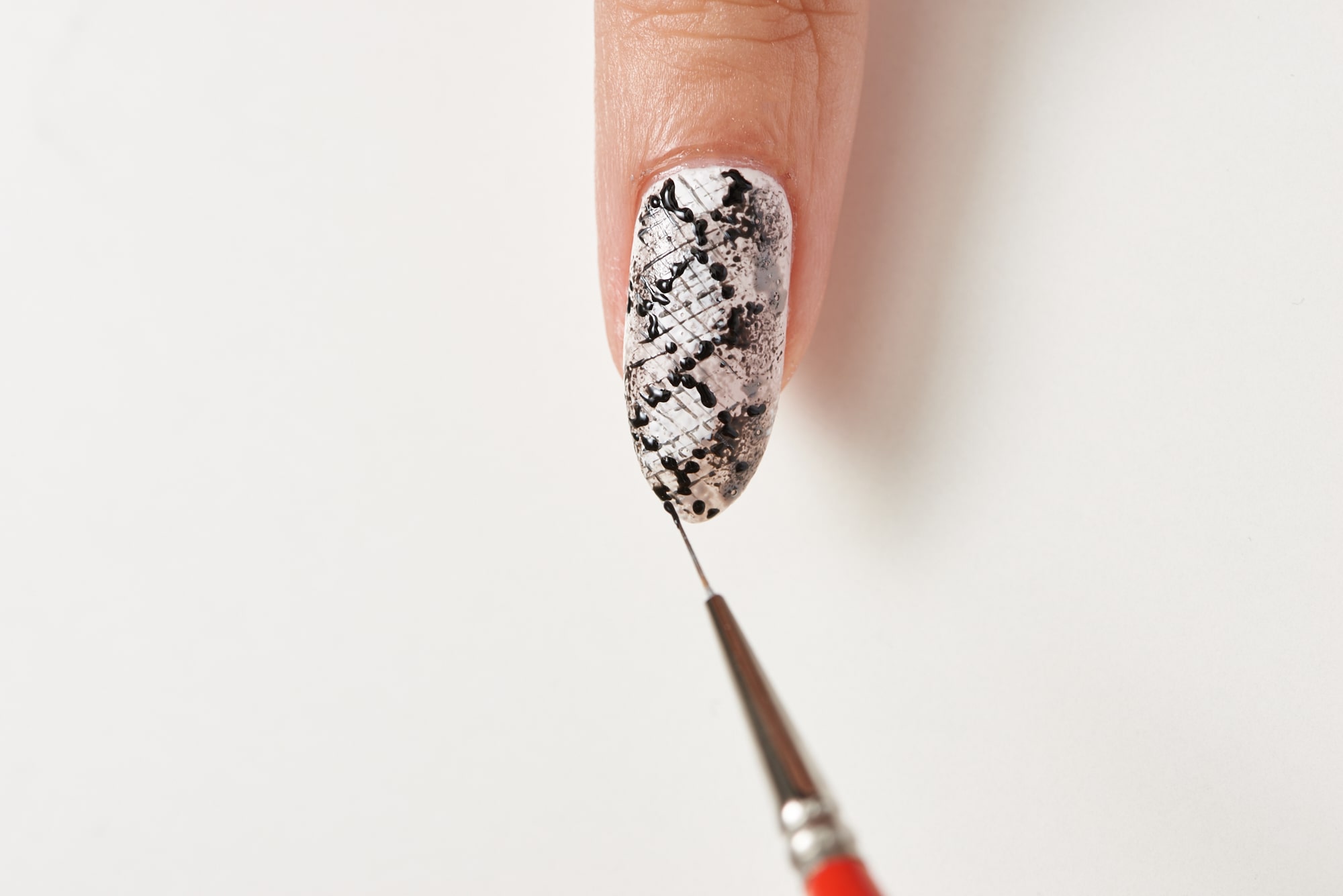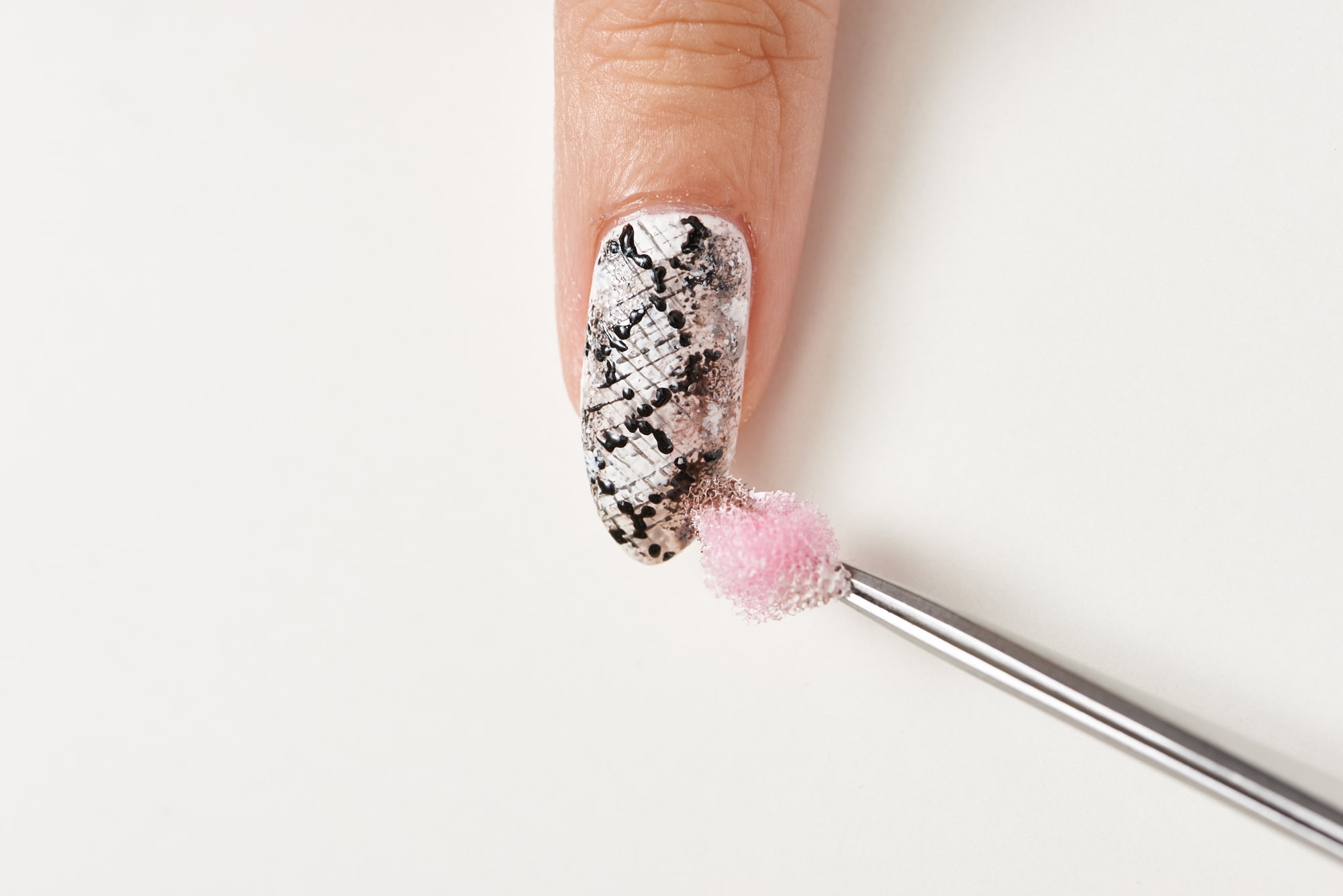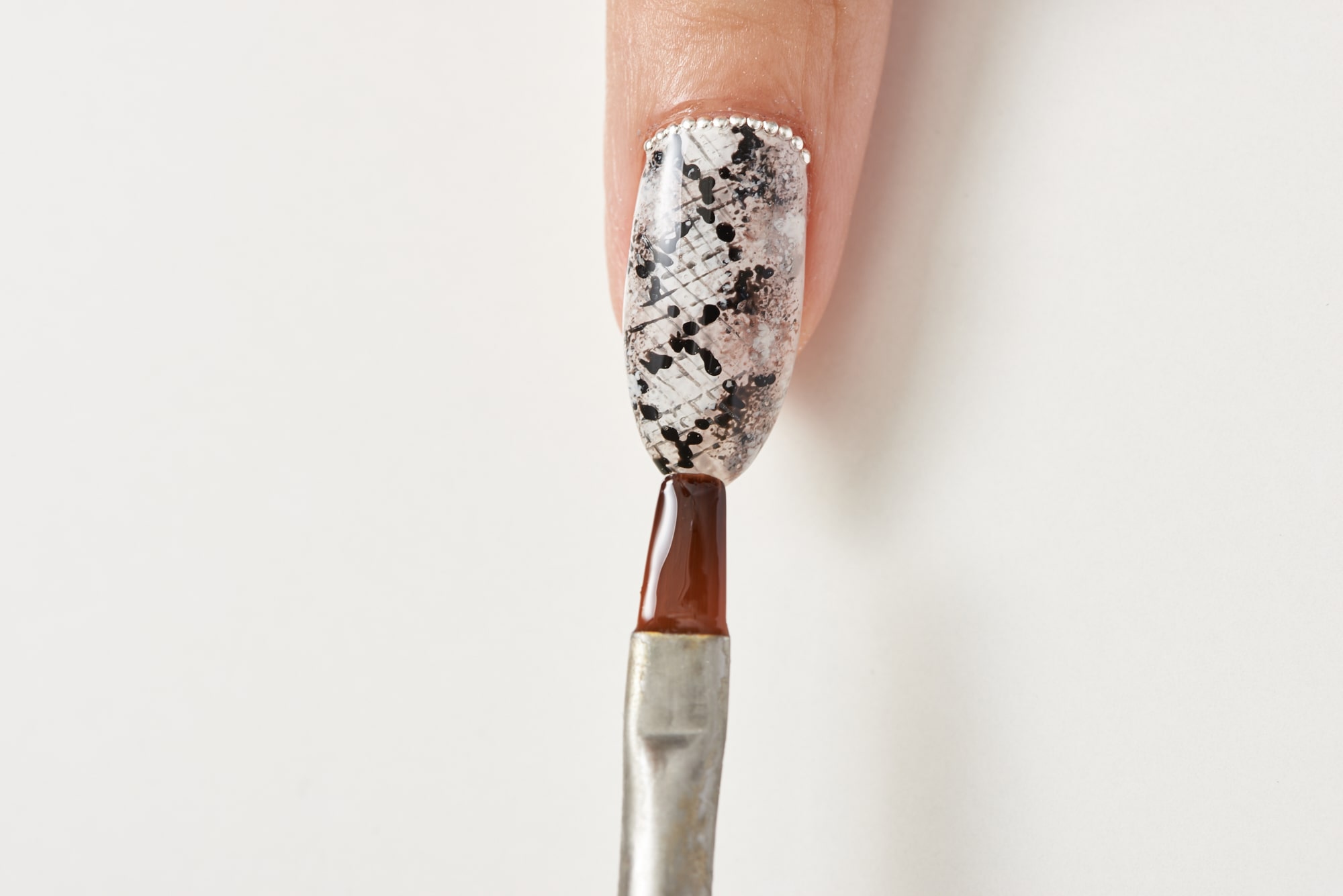 細筆に黒のカラージェルを取り、白の斑点を囲むように色をのせていく。ドットを打つイメージで、網目ひとつひとつを塗りつぶす。LEDを当てて完全硬化。