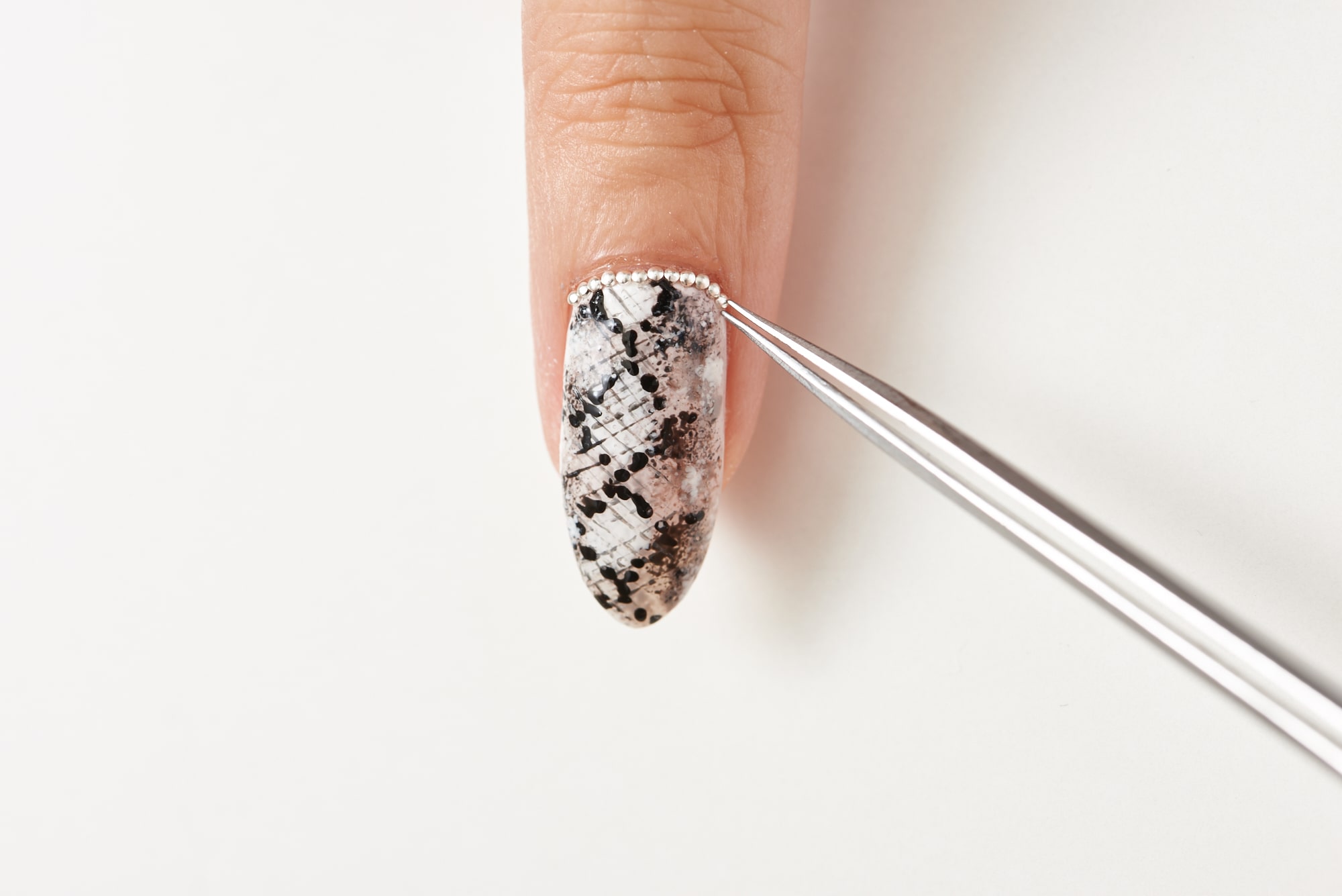全体にベースジェルを塗り、シルバーのスタッズを爪の根元にライン状にのせる。