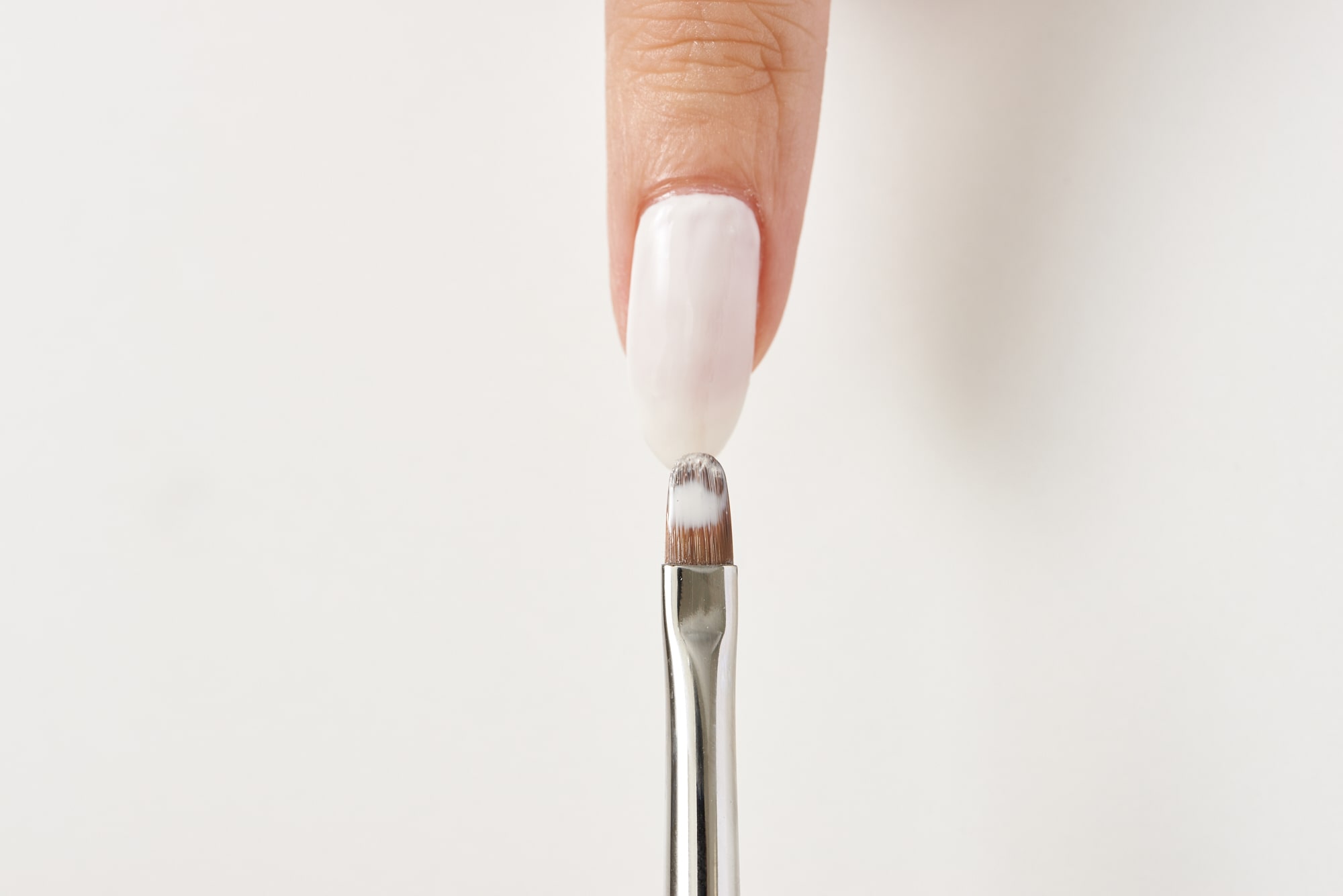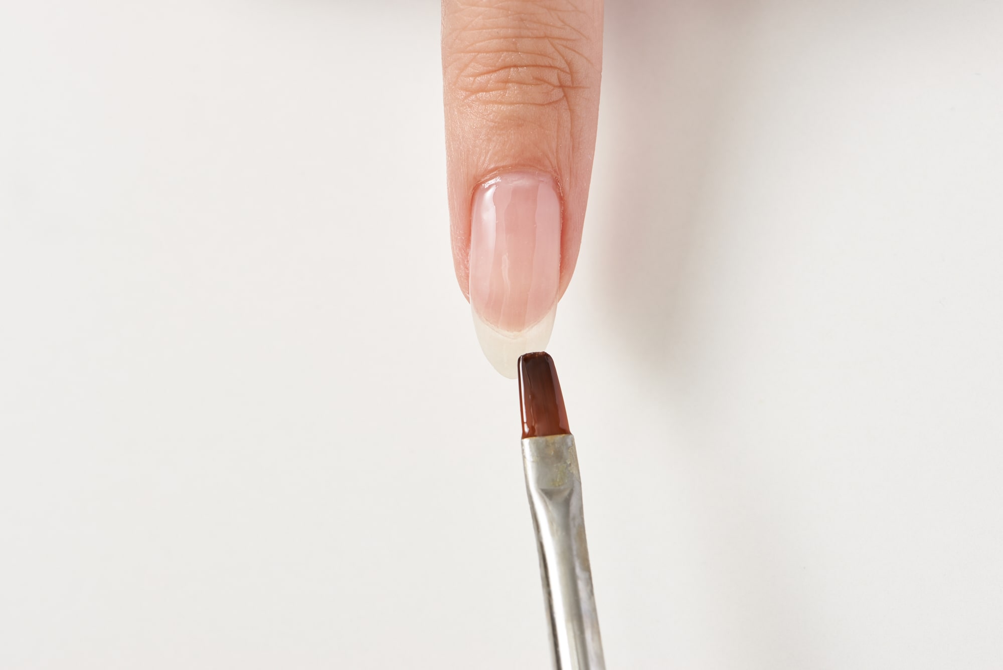 アイボリーのカラージェルを1度塗り。あえて透け感を残す。LEDを当てて完全硬化。