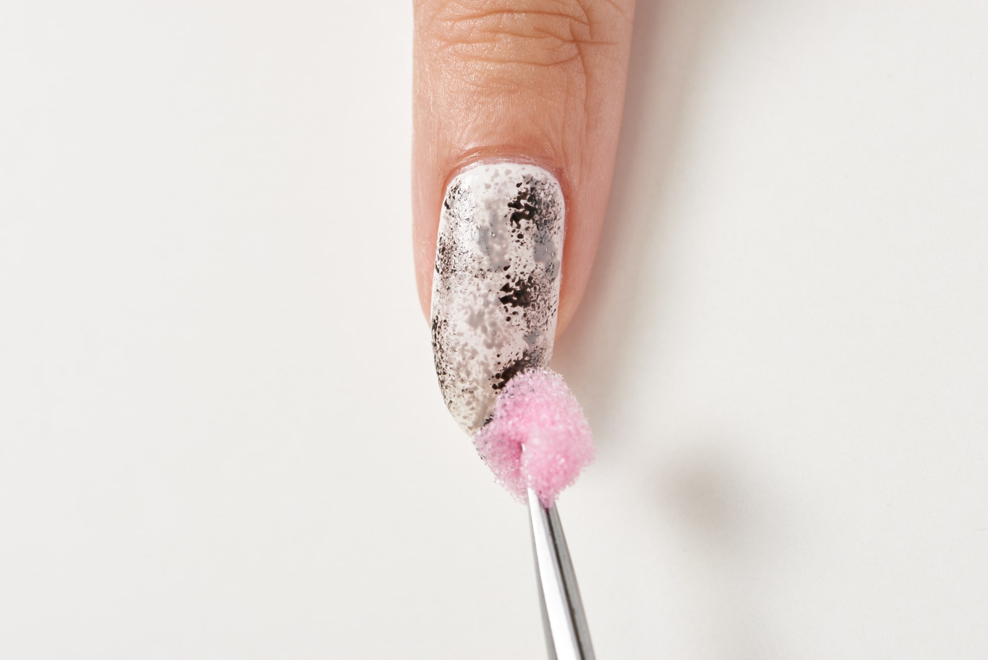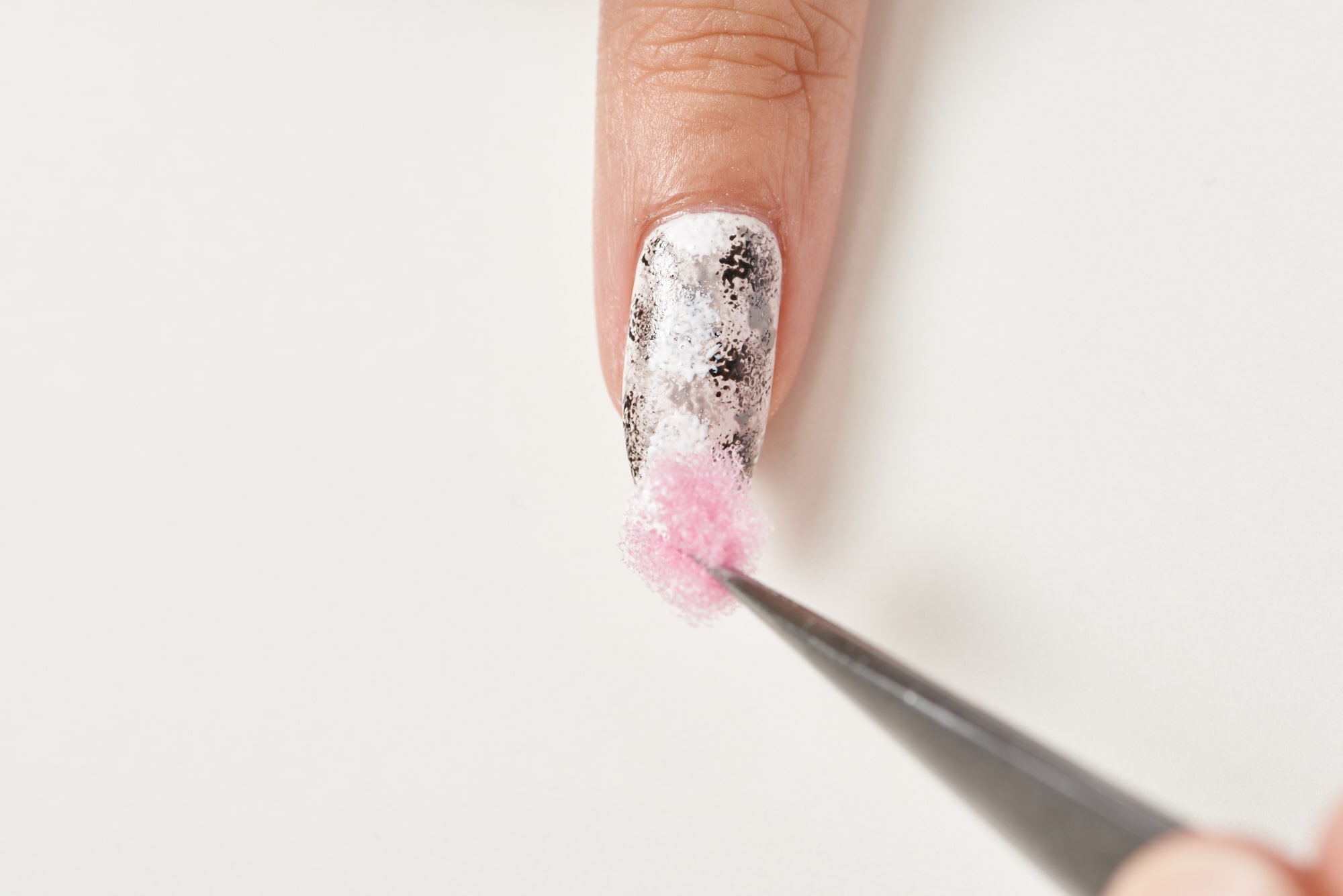 新しいスポンジに黒のカラージェルを取り、パレットで量を調整。グレーのラインに重なるように、3カ所ほどポンポンポンとのせる。LEDを当てて完全硬化。