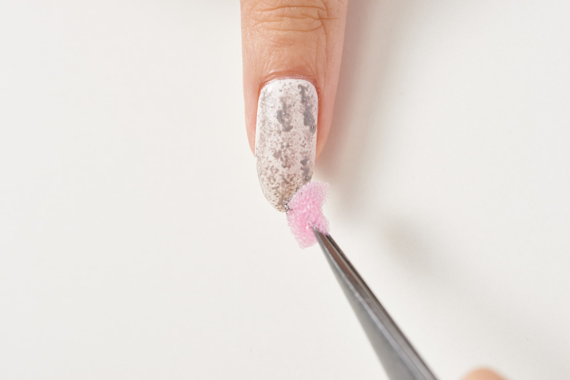 そのままスポンジで、3本のラインをイメージしながら、ポンポンと爪に色を乗せていく。色の濃淡ができるように意識しながら重ねること。LEDを当てて完全硬化。