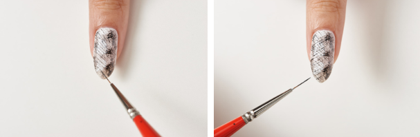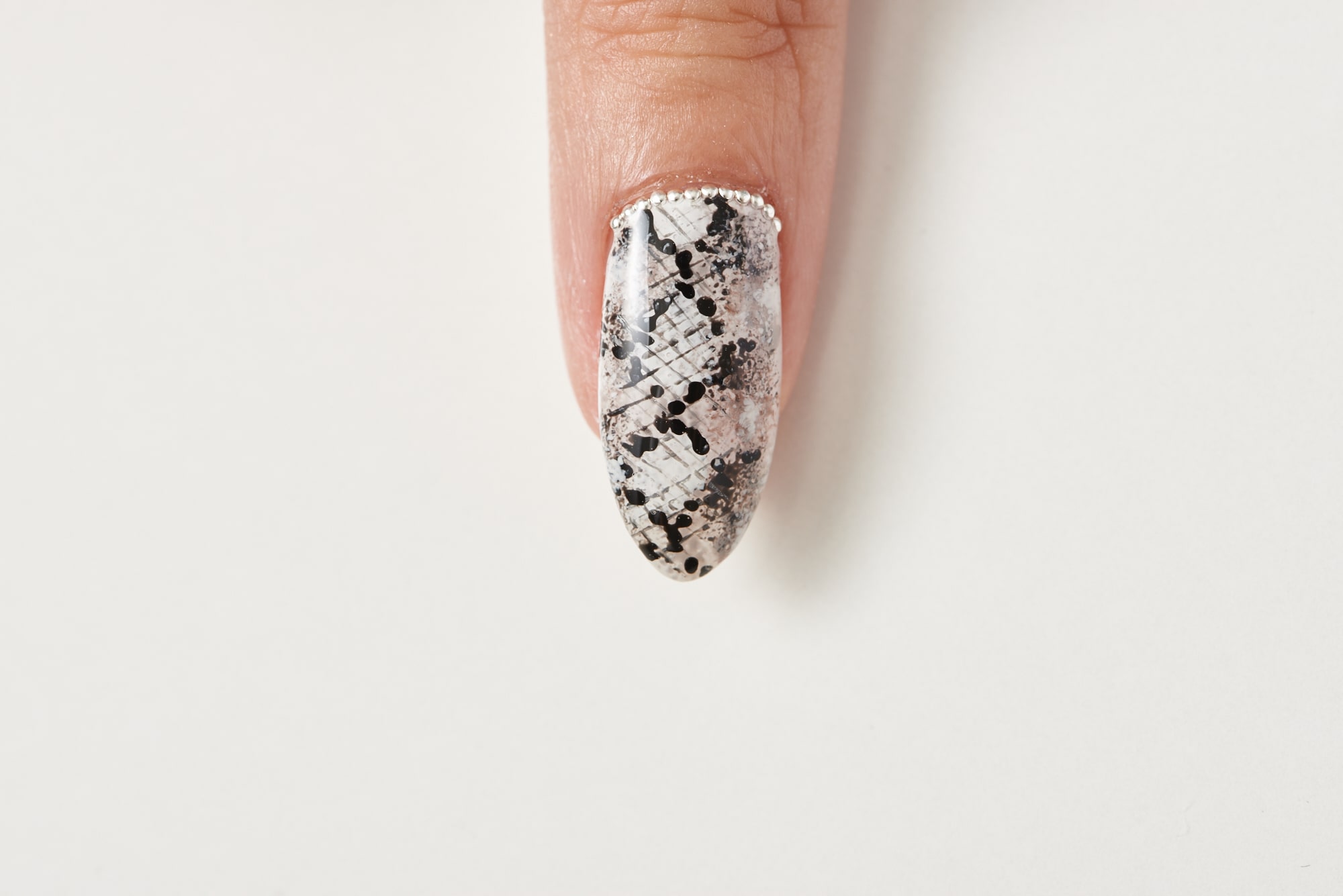 白と黒のカラージェルを混ぜずに、細筆にのせる。これにより、ラインにまだらに色が出る。白の斑点の上に斜めにラインを引いていく。できるだけ細く、はっきりさせ過ぎない程度に薄く。一度硬化し、さらに逆側から斜めにラインを重ねて網目状に。LEDを当てて完全硬化。