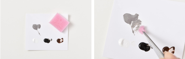 ペーパーパレットに、グレー、白、黒、茶色のカラージェルを出しておく。スポンジは小さくカット。ピンセットでつまんだスポンジに、グレーのカラージェルをなじませる。ベタッとつかないようにパレットで調整して。