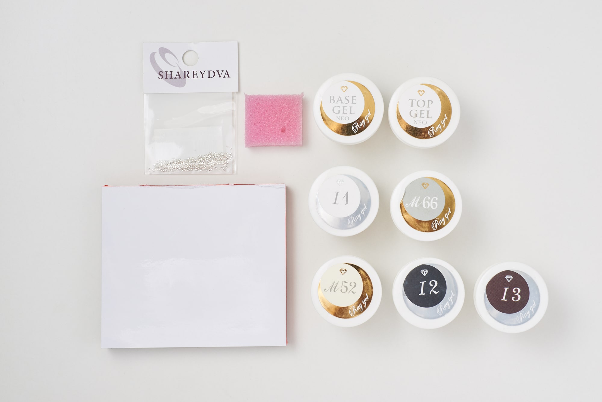 ベースジェル、トップジェル、カラージェル(アイボリー、グレー)、アート用カラージェル(白、黒、茶色)、スタッズ(0.8mm)、スポンジ、ペーパーパレット