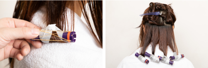 今回は低温デジタルパーマを使用。中間~毛先中心に1剤を塗布して前処理を行う。