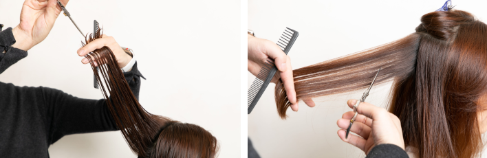 トップ~中間に動きが出るようにレイヤーを入れる。乾かした状態で、中間~毛先にセニングを入れ、量感とウエイトをコントロール。