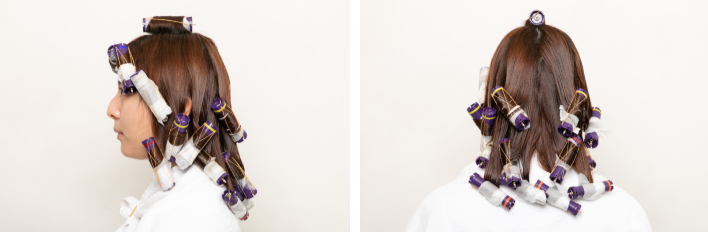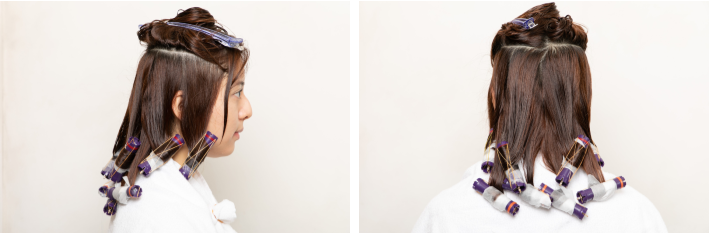 耳の高さでブロッキング。アンダーセクションは斜めに引き出し、18mmロッドで2回転のリバース巻き。