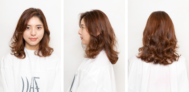 低温デジタルパーマを使うことで、ヘアアイロンで巻いたような仕上がりに。ダメージを最小限におさえながら、カール持ちのいいパーマスタイルが叶う。