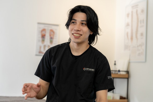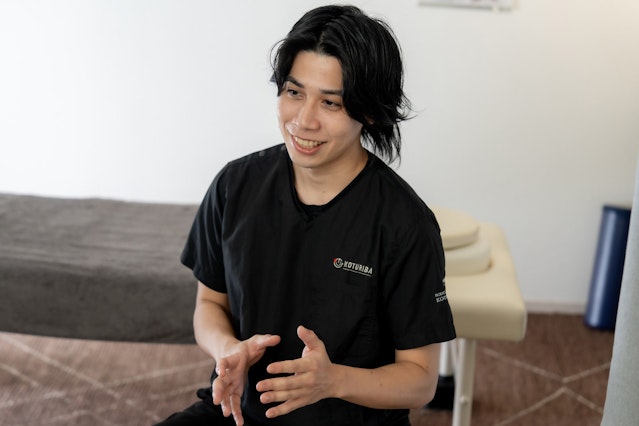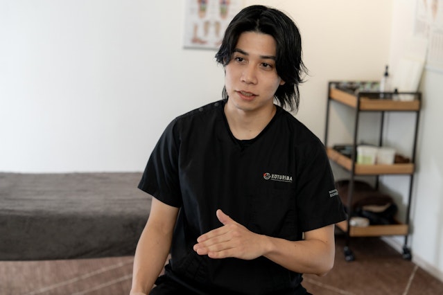 沖縄県出身。子どものころからサッカーに親しみ、「スポーツに携わる仕事がしたい」という思いからスポーツ整体・トレーナー学科のある専門学校へ進学。卒業後は整骨院に入社する。その後、脱毛サロン、産後整体サロンを経て、2025年1月に「KOTURIBA」へ転職。現在は麻布十番店の院長を務める。