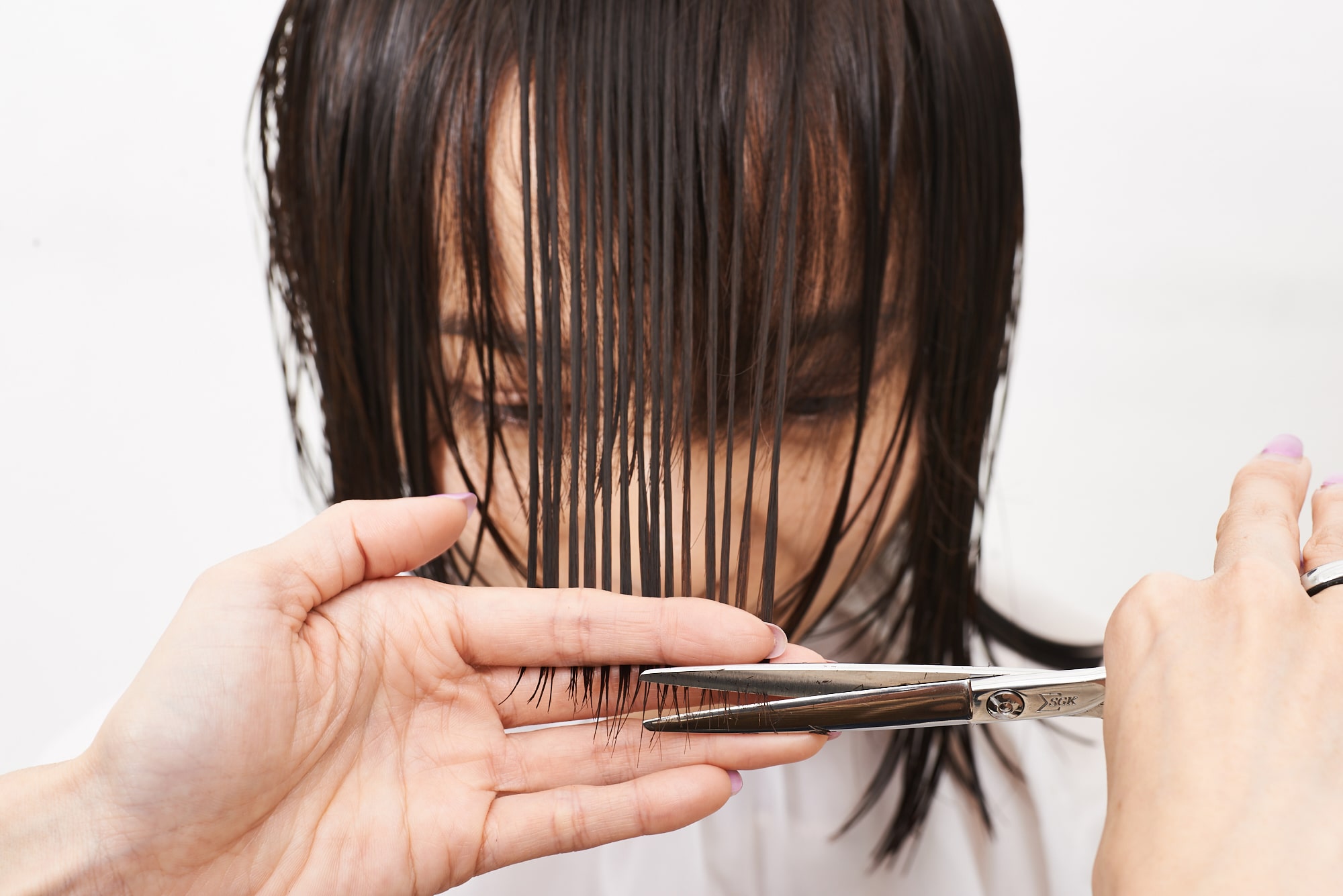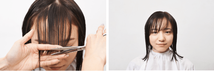トップを放射状に取りセンターで合わせて、前髪の長さでチェックカット。