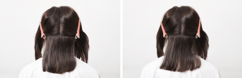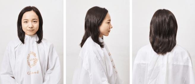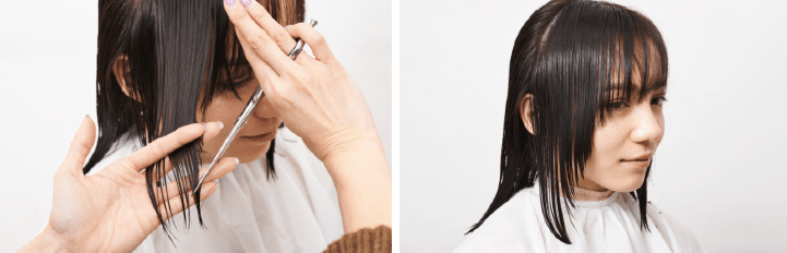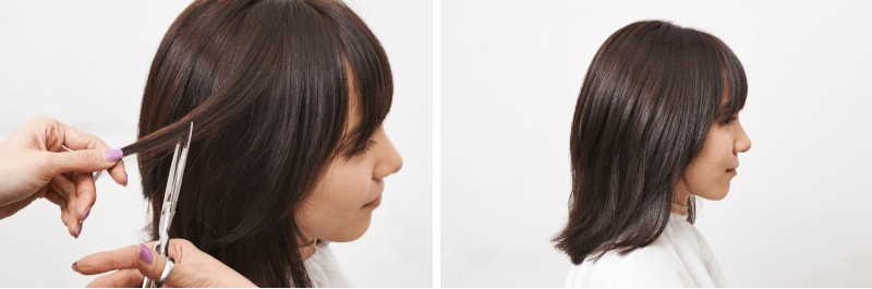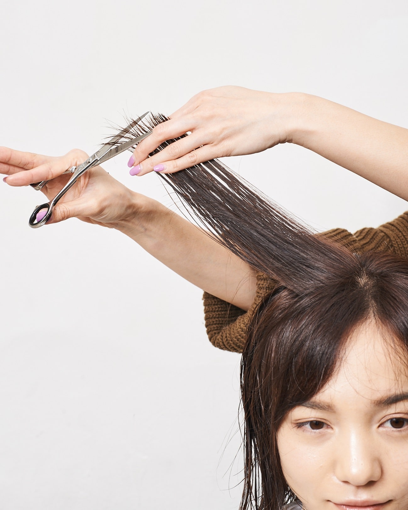 表面の髪の中間から毛先を、スライドカットで質感調整。動きを整えて完成。