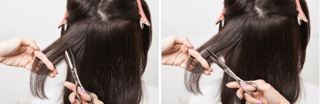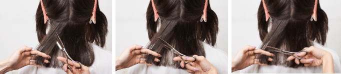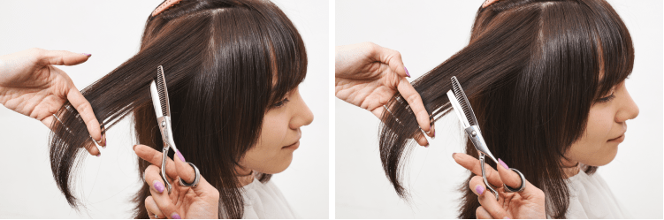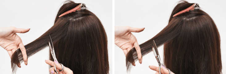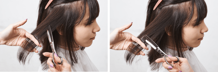 ミドルセクションもアウトラインを外し、毛先の毛量は取らないように、根元と中間にセニングを入れる。