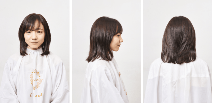 サイドは、バックの前上がりのラインの延長で、顔周りまでやや前上がりにカット。