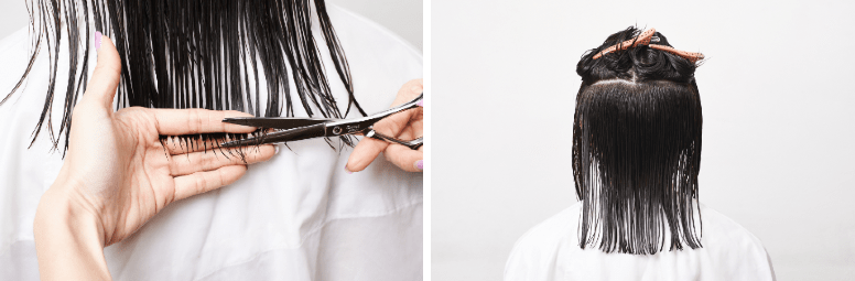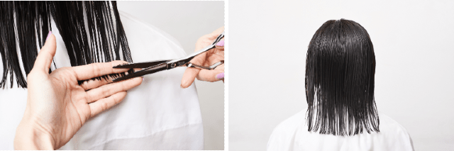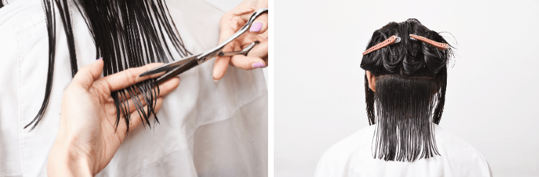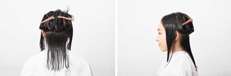 ウェットでスタート。フロントとバックをイヤートゥイヤーで分ける。バックサイドは3段に分け、アンダー1/3からカットする。