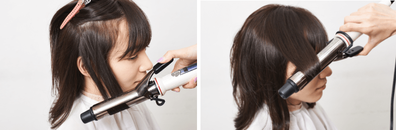 32mmのヘアアイロンで、ベースを外巻きにワンカール。表面は内巻きに毛先をワンカールさせる。ジェルワックスを中間~毛先にもみこんで動きを出す。