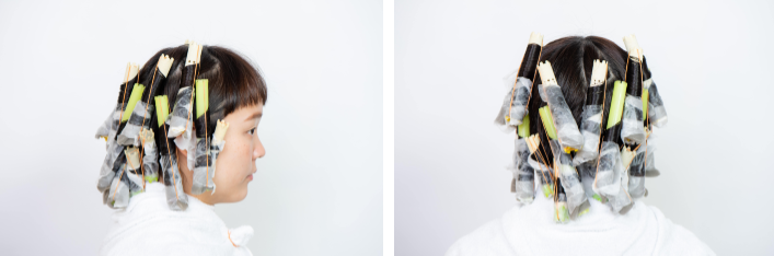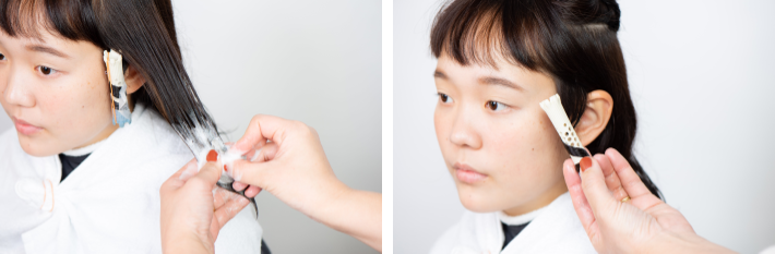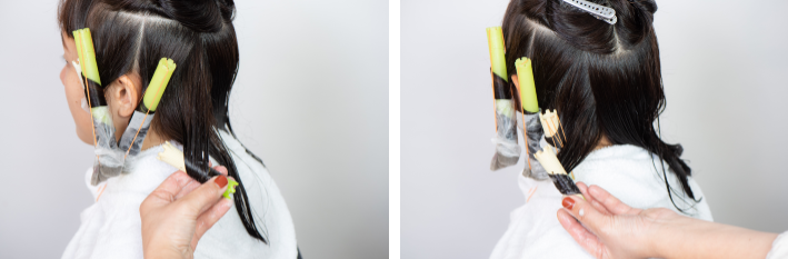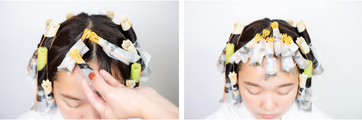 エアウェーブを使用。パーマ液は泡状にすることで、液体よりも操作性が高く塗り分けがしやすくなる。14mmの円錐ロングロッドで、リバースに2回転巻き、さらに逆巻きで2.5回転巻く。