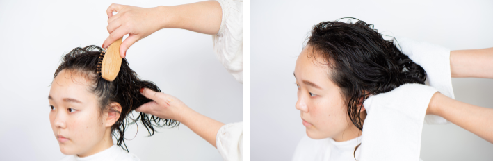 洗髪後、根元からブラシを通してオールバックにかき上げ、左右に大きくブラッシング。乾いたタオルで下から持ち上げながらタオルドライし、毛先にオイルをもみこむ。根元に風を当てながらドライヤーで乾かす。毛先は手の中に隠し、風を送り込むようにして。