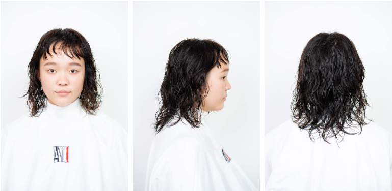顔周りと髪表面に低めのレイヤーを入れることで、パーマをかけたときに動きが出るようにする。