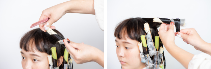 前髪は上下に分けて巻いていく。13mmの円錐ロッドを使用し、巻く方向を交互にミックスする。