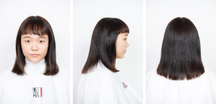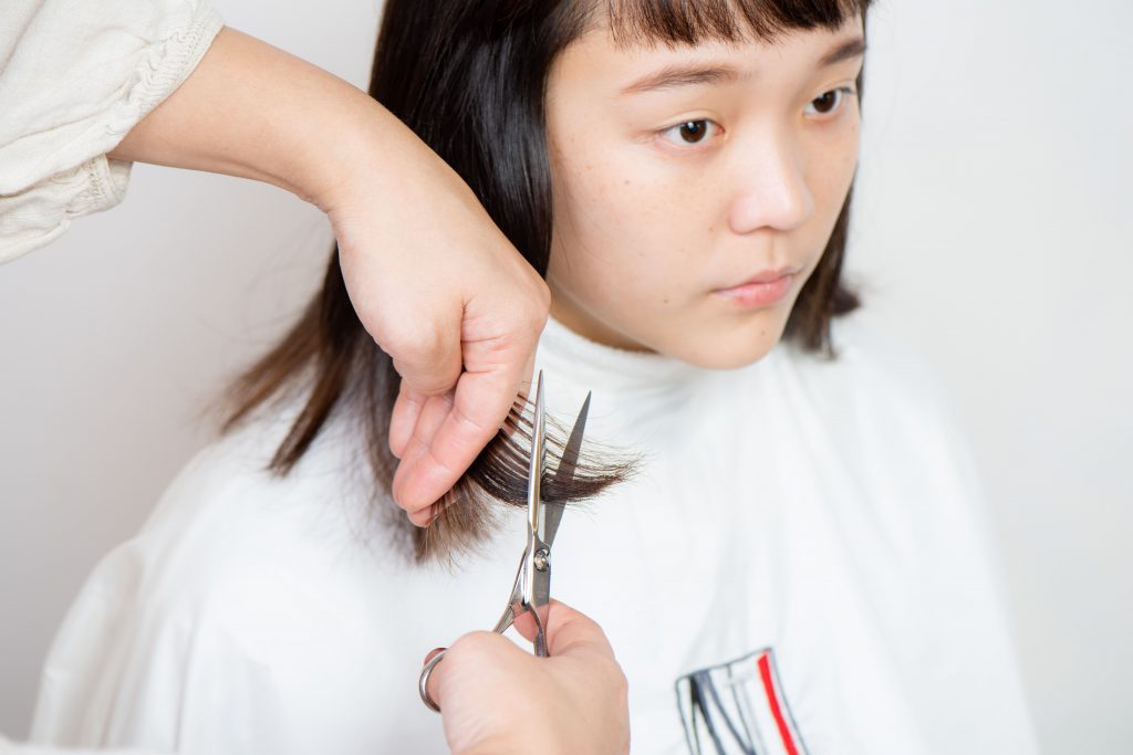 やや細く柔らかい髪質。毛先にカラー履歴があり、ややダメージも。