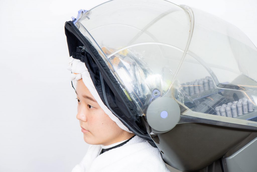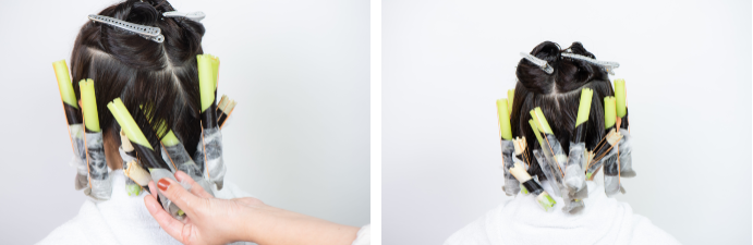 エアウェーブのマシンに入って10分クリープ後、一度水洗してさらに8分乾燥。2液を全体にかけ、5分放置後、ロッドを外して水洗する。