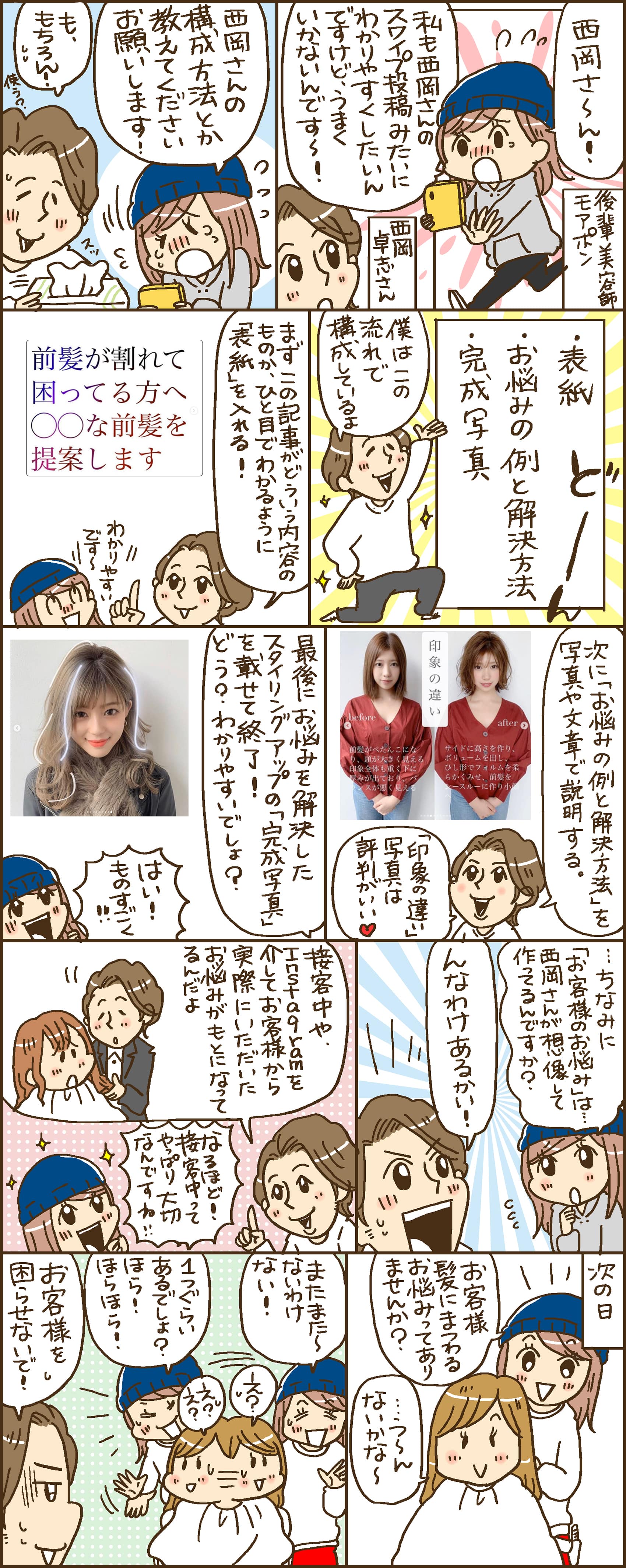 見やすいレイアウトと読みやすい言葉を意識して作った写真が多くのお客様の注目を集めている人気の美容師。お客様からのお悩みを解決したスワイプ投稿が多くの方に支持を得て、月の売り上げが最高で850万円を突破するまでに!