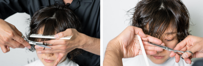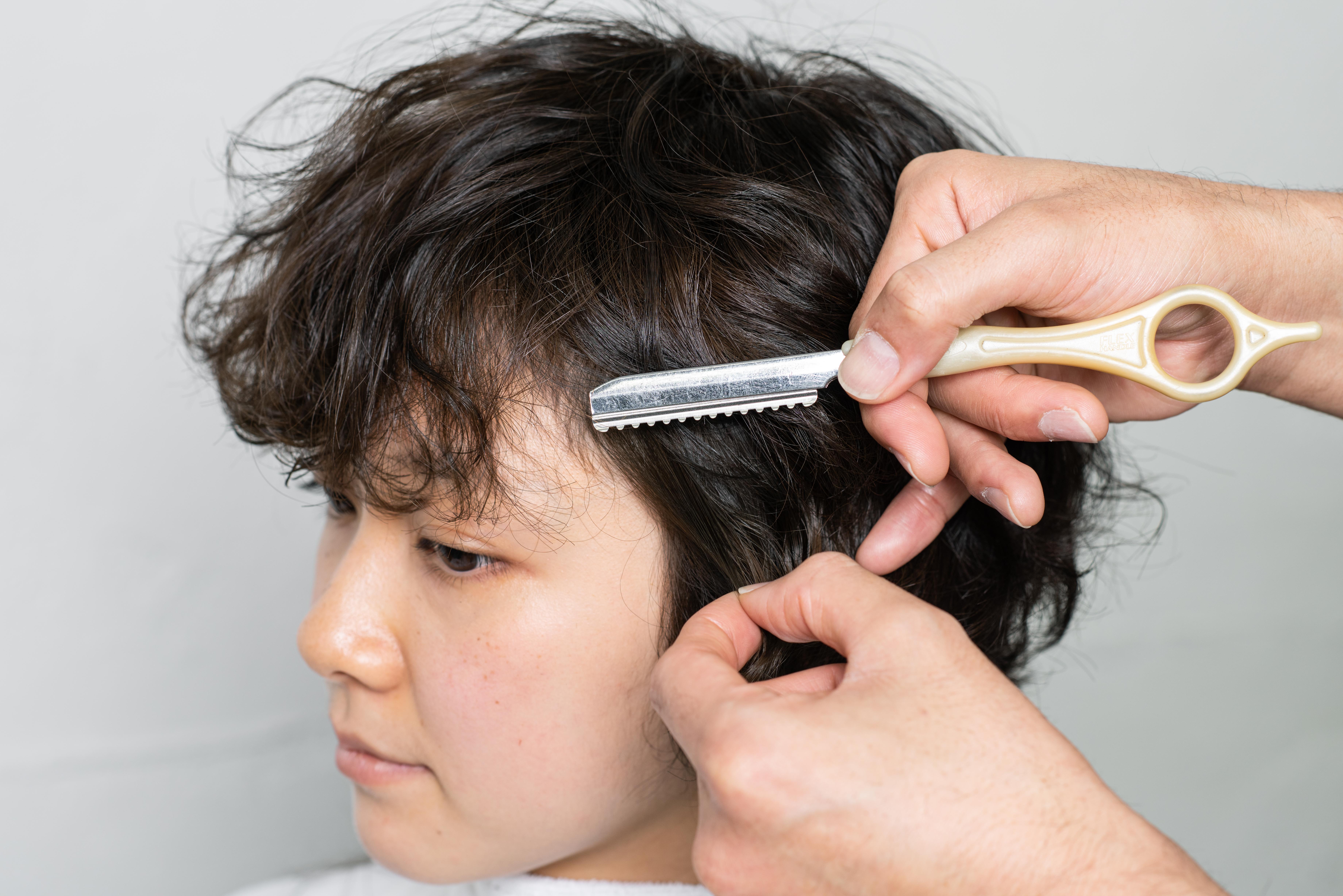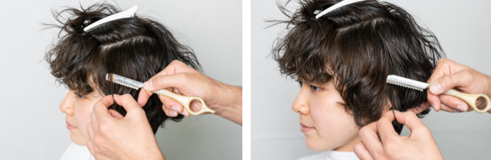 サイドバングは、前髪をガイドにレザーカット。ガイドをつなげていくことで、マッシュラインに。