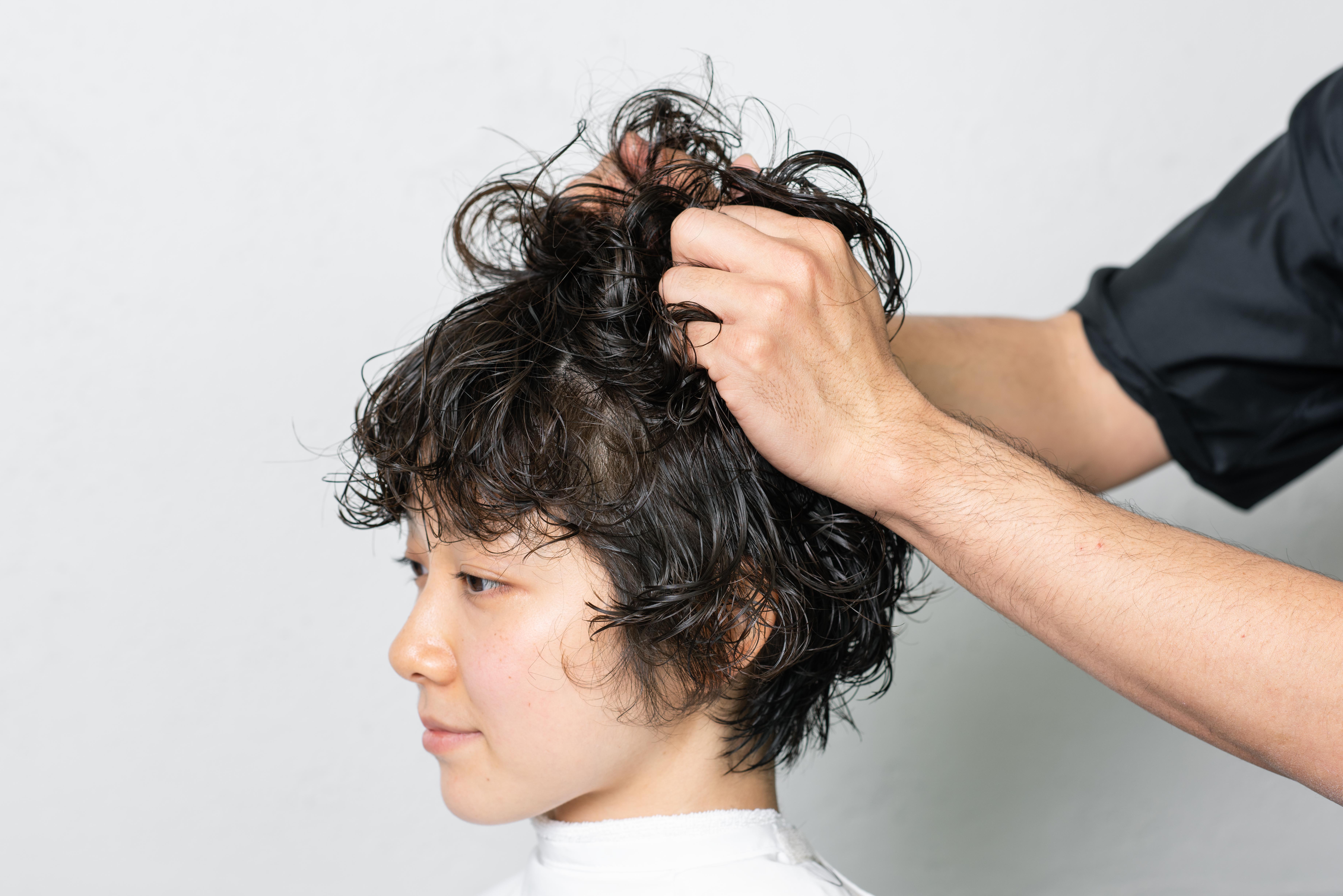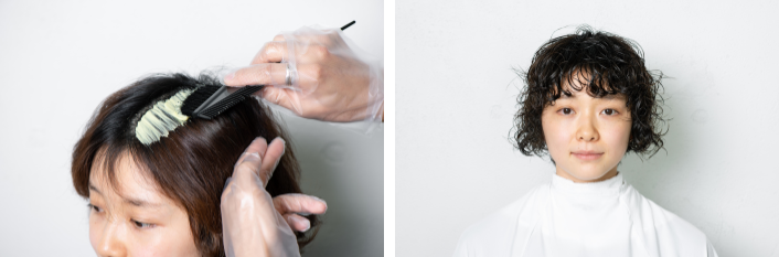 他店でのパーマ履歴を活かしつつ、今っぽいニュアンスを取り入れたデザインを「Rougy」の薫森正義さんが提案! 薫森さんが今気になっているというマッシュバングで、ほんのり色っぽくおしゃれなデザインが完成しました。