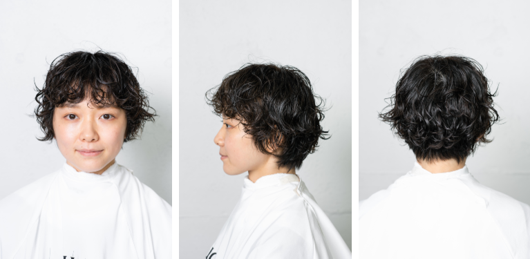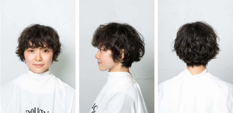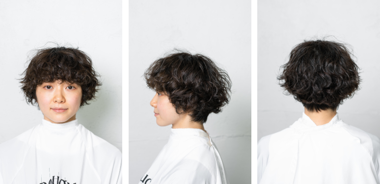 パーマの履歴をいかしたマッシュラインのショートが完成。丸いフォルムで可愛らしい印象がありながら、長めの前髪と襟足でほんのり色っぽく。レザーカットによる柔らかな毛先のラインでフィット感もアップ。