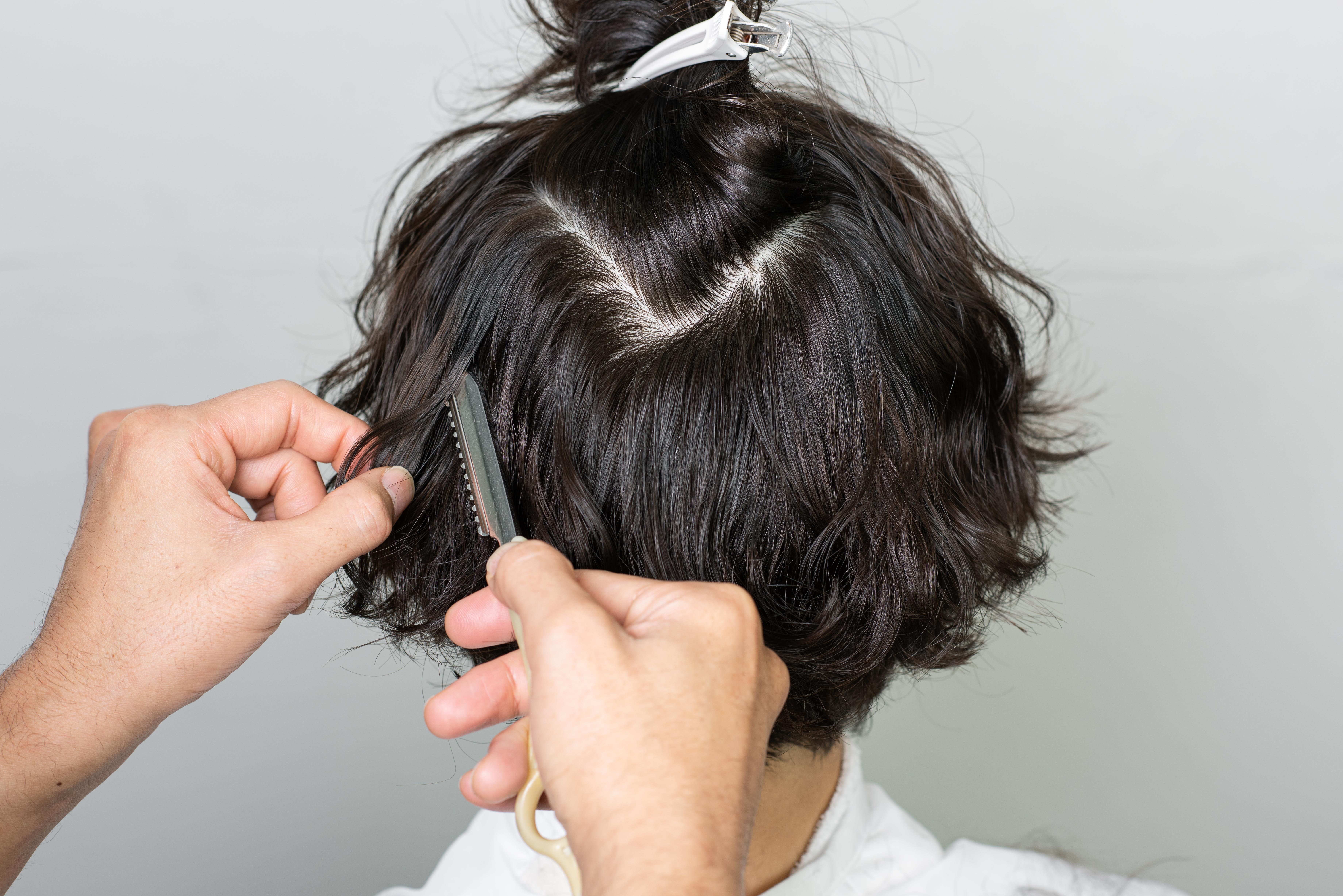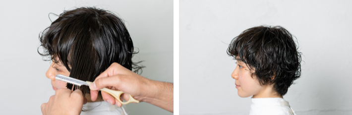 パーマの履歴があるので、毛量調節の際は骨格をよくチェックして。どこを間引けばフォルムが整うか、きちんと見極めることで最低限の調整で済むように。