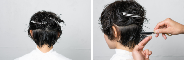 ネープをブロッキング。前下がりラインになるように、センターをやや上げるイメージで縦に引き出し、角を削るようにレザーカット。