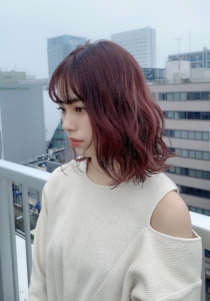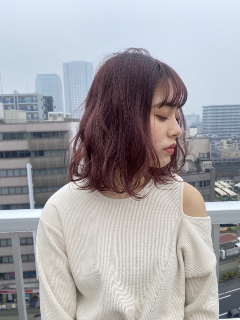 「伸ばしかけでも可愛い、レイヤーミディアムスタイルです。ピンクだけでなくベージュも混ぜることで、よりやわらかいピンクに仕上げています」