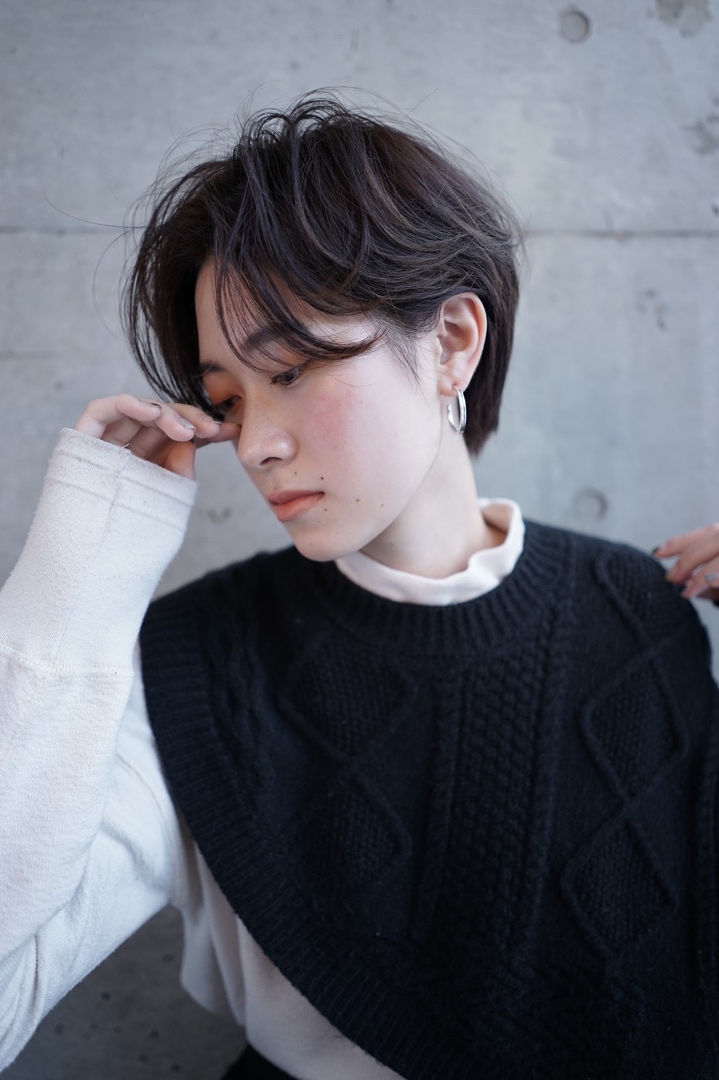 「清潔感のあるショートスタイルです。トップにふんわり感を意識したレイヤーを入れたことがこだわりで、センターパートも魅力のポイントです。ターバンなどのアイテムを使った、アレンジも得意です」